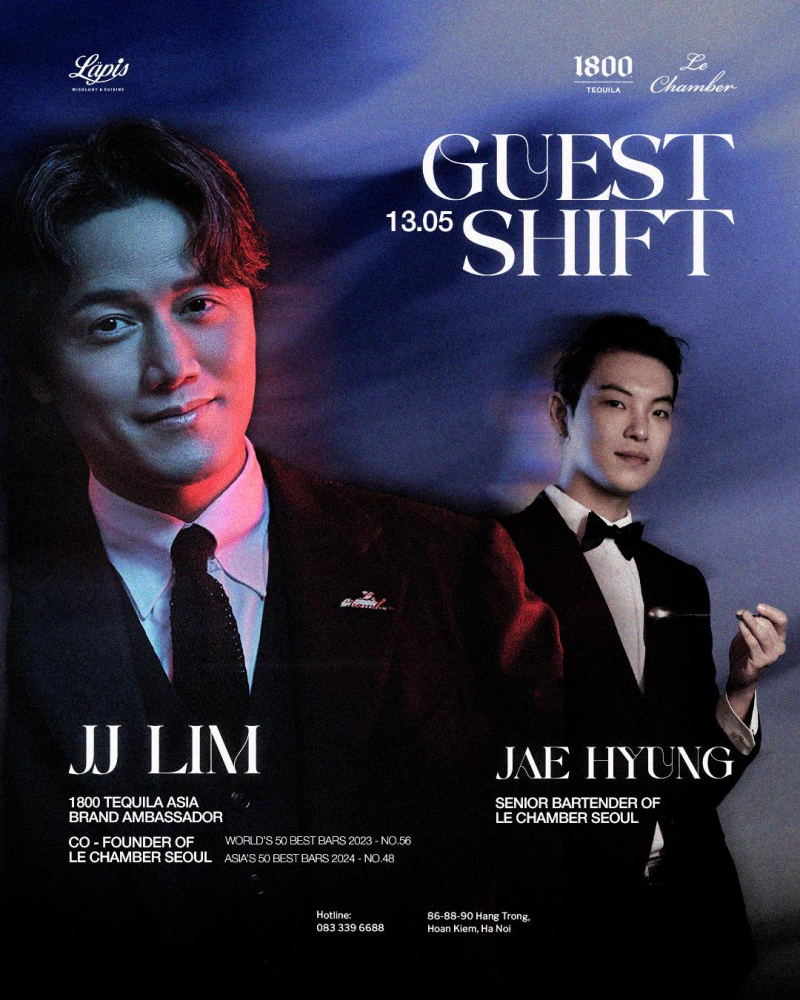 JJ Lim: Co - founder của Le Chamber, Asia Brand Ambassador của hãng rượu 1800 Tequila, với 12 lần vinh danh Top Asia’s 50 Best Bars và 3 lần vinh danh World’s 50 Best Bars, ghi dấu ấn với phong cách pha chế chuẩn quốc tế cùng hương vị đậm tinh thần Hàn Quốc đương đại